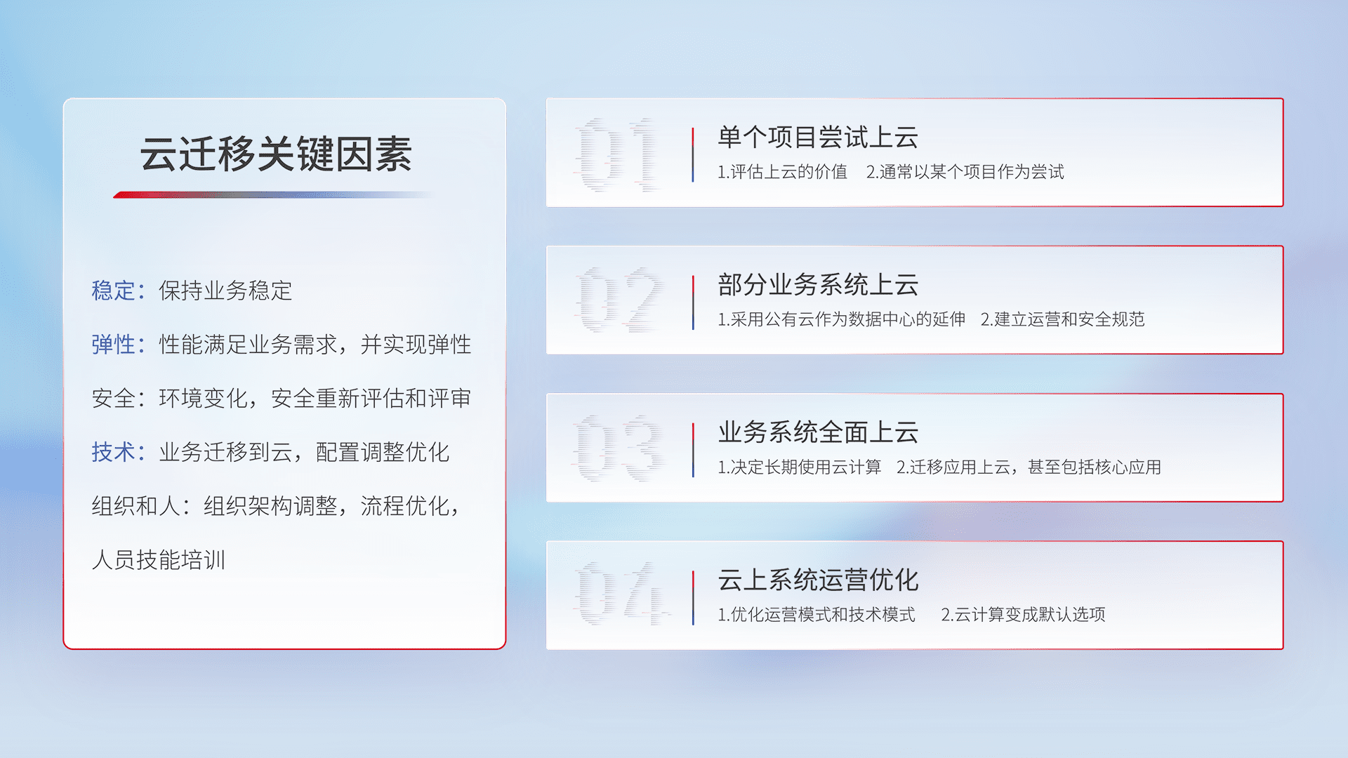 结合实际业务,,从规划设计、、、、云平台选型、、、云原生改造、、数据迁移、、集成交付,,,迁移全过程为客户识别最佳上云路径,,做好风险识别管理,,设计网络架构、、、、身份权限、、、、安全审计合规、、、操作审计、、、日志审计、、、、监控告警策略、、、多站点容灾设计等,,,对云上基础设施进行整体规划,,提升IT治理水平,,,以满足弹性、、、、高可用、、高性能的需求。。。。